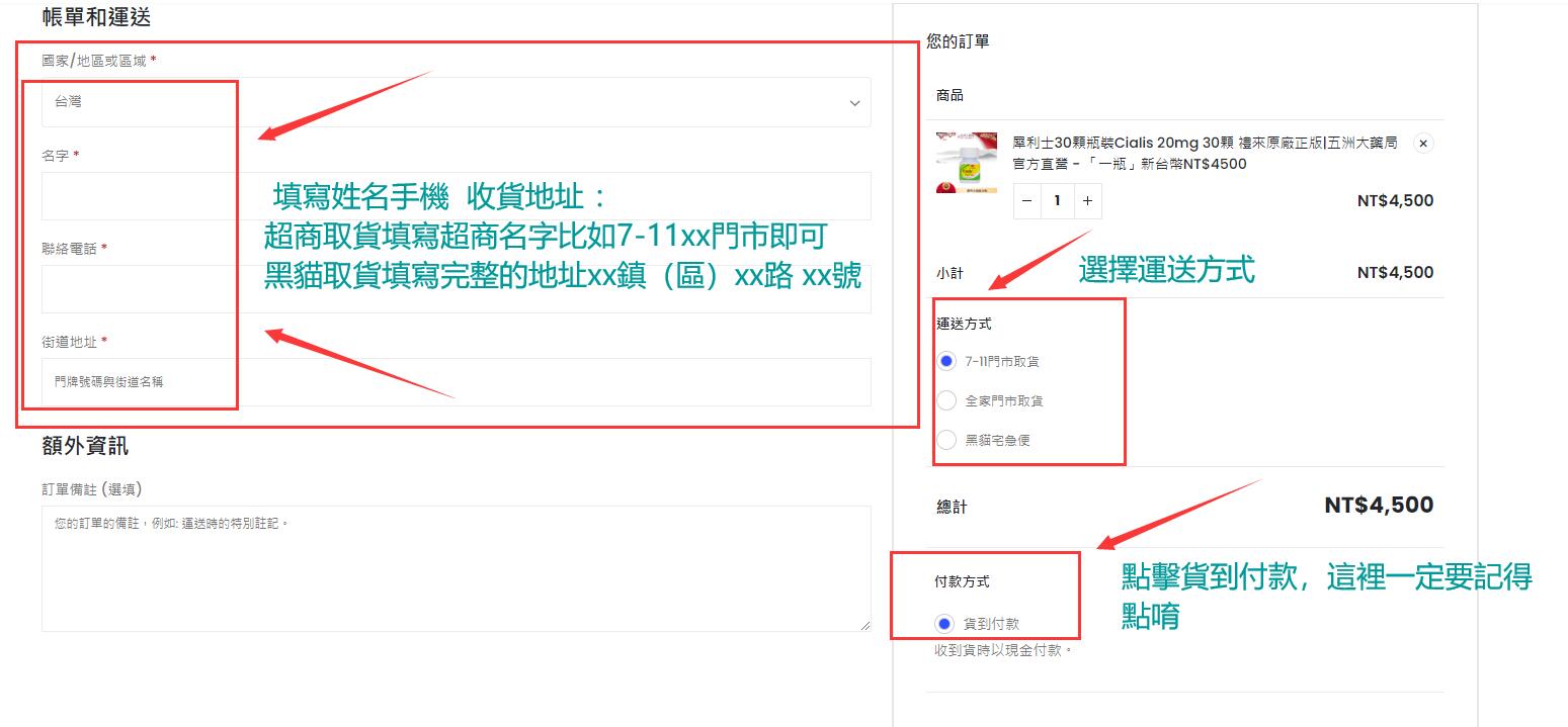 二: 填寫姓名手機 收貨地址 :超商取貨填寫超商名字比如7-11xx門市即可 黑貓取貨填寫完整的地址xx鎮(區)xx路 xx號
