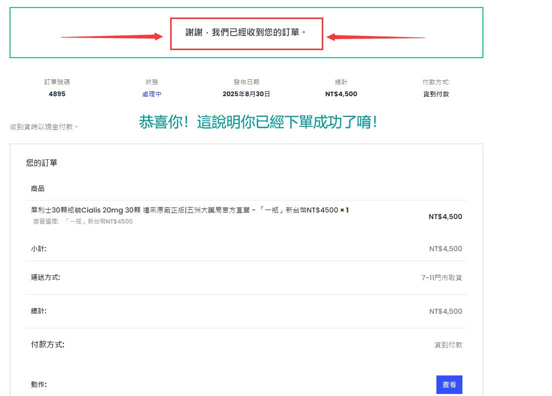 四:親愛的,辛苦你了,終於來到最後一步了,其實在你點擊下單購買的一瞬間,您已經下訂成功了的,為了再次確保您下單是否成功,請您看後續跳轉後的頁面(如下圖)